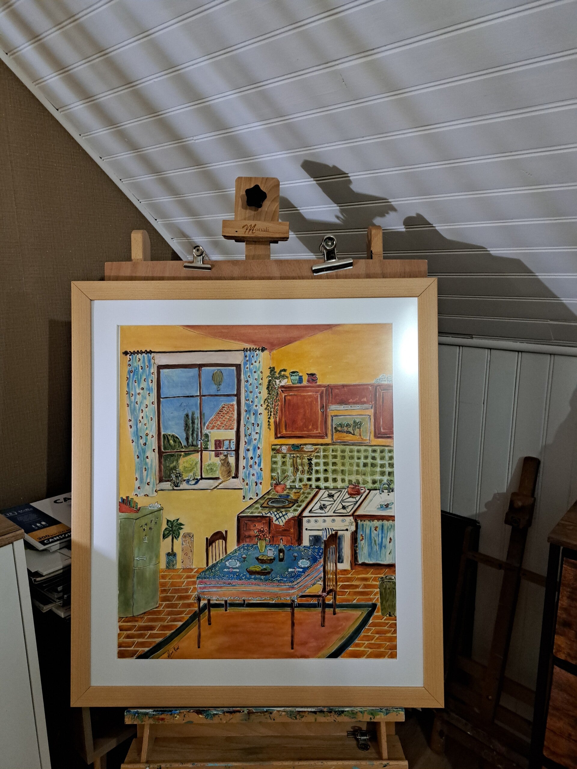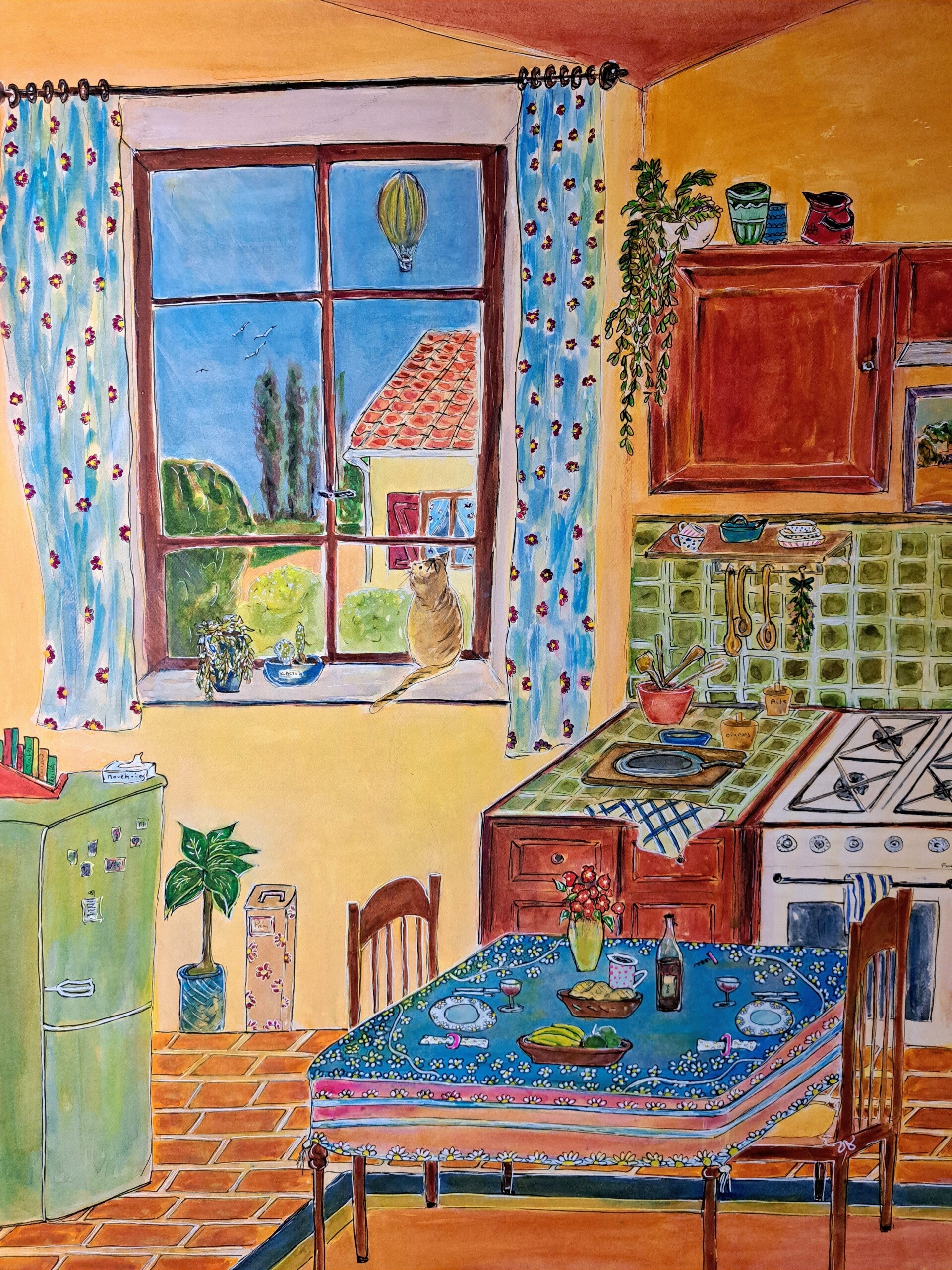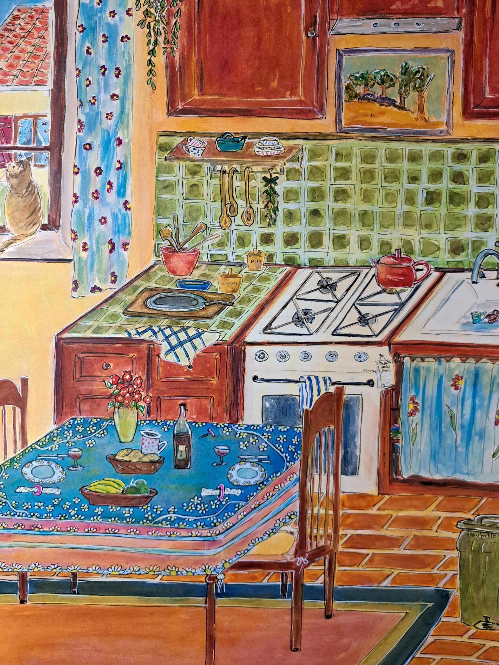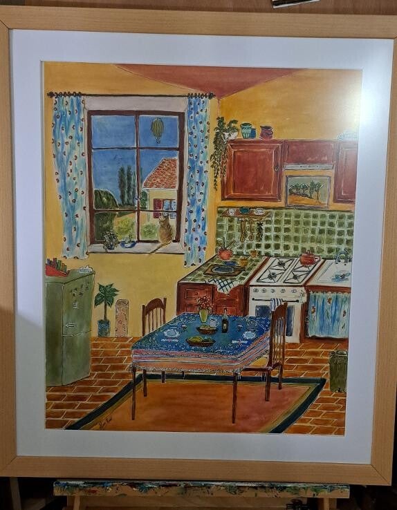 Cette aquarelle au format 50 × 60 représente une cuisine baignée de lumière, avec une fenêtre à gauche ouvrant sur le jardin.La table est dressée, la vaisselle colorée se mêle aux tons verts, bleus, rouges et orangés, créant une atmosphère chaleureuse et joyeuse. L’ensemble, au style naïf, respire la simplicité et la passion d’un artiste amoureux des scènes de vie.